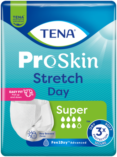 TENA ProSkin Stretch Day unisex genlukkelig ble til inkontinens mere moderne kategori af beskyttelse sammenlignet med andre klassiske design for voksenbleer. Den har store velcrolukninger og brede, meget strækbare sidepaneler med henblik på brugervenlighed, tilpasning og komfort. Den kan også trækkes op og ned som almindelige underbukser eller buksebleer, mens den forbliver sikkert på plads, hvilket tillader mere selvstændig brug og gør toiletbesøg lettere.